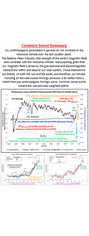 The chart below compares the average global temperature (the average of the Vinther et al Arctic and the Antarctic EPICA Dome C datasets), the global atmospheric CO2 concentration (from Antarctic ice cores), and the Relative Paleo Intensity (RPI, essentially an indication of the earth’s magnetic field strength). Why does the RPI correlate with the Holocene climate? A complicated question, but the RPI is very likely a representation of the gravitational and electromagnetic interactions of the solar system and beyond. That would include the Milankovitch cycles as well as the direct contribution (i.e.: lower magnetic field strength means more solar energy enters our biosphere, contributing to the changes in our climate). The RPI data resolution is 200 years, so the many shorter solar/ocean cycles are not reflected in the RPI data. RPI correlates to the Holocene climate, CO2 does not!