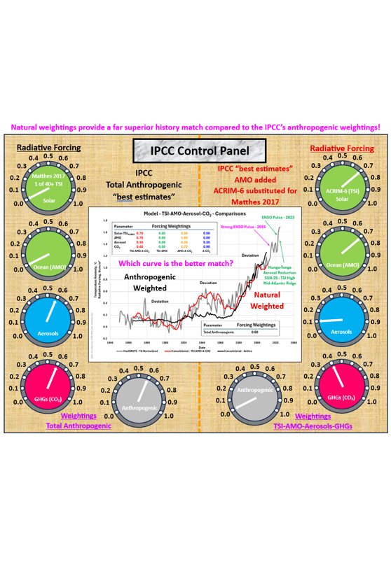 The models do include a solar forcing, but the IPCC has limited their choice (i.e.: cherry-picked) to just ONE of the 40+ TSI reconstructions available. Their choice fits the alarmist narrative and has been further modified to mute any solar influence. There are many other TSI reconstructions that are capable of history matching the Modern Temperature Record (MTR, 1850 to the present) directly and more closely than the IPCC anthropogenic models do. All those 40+ reconstructions (including the IPCC’s Matthes et al 2017 reconstruction) can be used as a proxy to produce a representative history match of the MTR. All without CO2 contribution. Using the TSI as a proxy is a valid option for modeling. The TSI is a small component of the overall solar forcing, but it is the only solar forcing parameter included as an IPCC “best estimate.” Cosmic Ray Flux (CRF, affecting cloud formation and albedo) and High Energy Particles (HEF) are programmed into the CMIP6 models but have effectively been turned off. When TSI is high, more HEP reach the earth and the CRF is lower due to stronger solar winds, leading to less cloud nucleation (more sunshine hours) and ultimately warming.